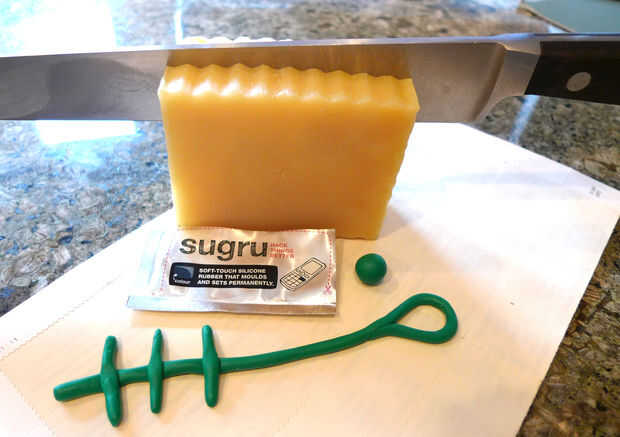 En primer lugar hacer una serpiente larga de su Sugru con lazo en el extremo como se muestra. Utilice la barra de jabón para medir cuánto tiempo hacerlo. He añadido algunos travesaños para que la "cuerda" se mantengan dentro del jabón.
