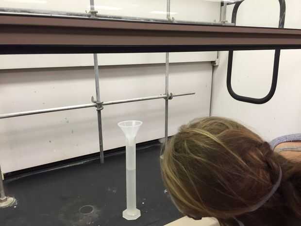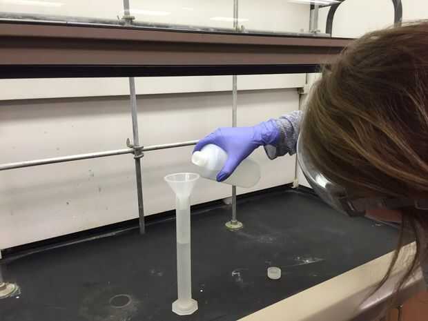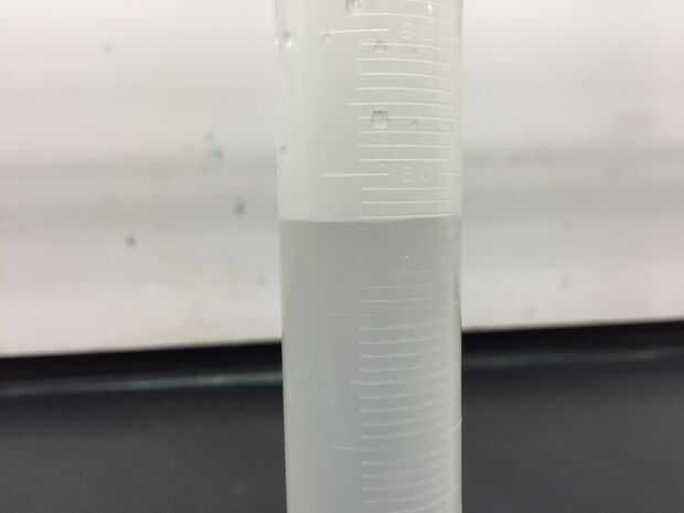 Este es un paso muy importante y peligroso. El NaOH es muy cáustico y puede quemar seriamente. Si usted tiene alguno en su piel, neutralizar inmediatamente en el vinagre. ¡Ten cuidado! Usted tendrá que medir exactamente 76,5 ml de NaOH. Puede lograr NaOH en una ferretería local o en línea en un sitio web de la fabricación de jabón.
