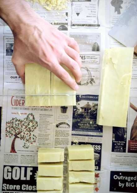 No entiendo ese último paso hasta el día siguiente cuando tomé los bloques de jabón hacia fuera para el corte. El jabón que había sido aislado era rock duro, mientras que el cubo de mezcla sucio que había dejado fuera en el frío tenía jabón, demasiado, pero el tipo de smooshy al tacto. Calor es claramente una mercancía. Cortar barras de 1 pulgada de espesor que (dependiendo de los moldes) salieron a unos 2 o 3 onzas cada uno. (Y sí, yo estaba chillando de placer con cada barra). Luego arregló que se sequen y les dejó solo durante unas 6 semanas curar en bares agradables y duros.