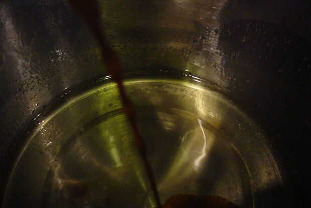 Una vez que tanto la mezcla de lejía y la mezcla de aceite son de 110 - 125 grados ponen los guantes, y protección para los ojos, suavemente Vierta la mezcla de lejía en los aceites (no vierta los aceites en la mezcla de lejía) removiendo continuamente. Una vez que se combinan, si tienes una licuadora palo usarlo ahora... le ahorrará un montón de agitación