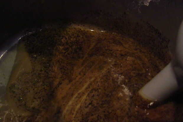 Una vez que estés en este momento rápidamente la mezcla de ricino los aceites de almendra, y el café. Mezcla bien, luego Vierta la mezcla entera en su molde con su raspador para obtener todo.