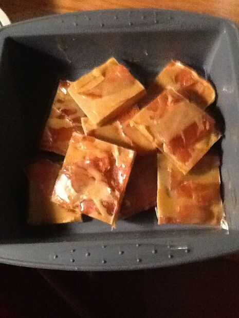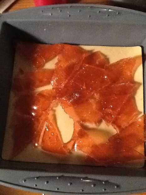 Ahora nos derrita una pequeña, pero de blanco y la corteza. Lo del olor, color y póngala a un lado. Poner la corteza en el molde. Poner las frambuesas en la parte superior y vierte la clara en él. Que desarrollar una piel resistente y vierta la corteza derretida en la parte superior en corone. Rociarlo todo con alcohol y se deja establecido. Desmoldar y cortar en cuadrados.