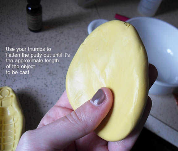 Utilice los pulgares para alisar la masilla en un cojín alargado, aproximadamente la longitud de la Granada.