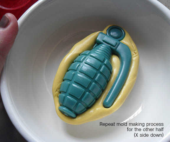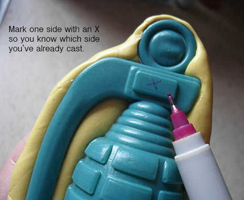 * En este punto, he marcado mi Granada plástica con una pequeña "X". Esto ayudará a decirme qué lado ya he fundido, por lo que no haya confusiones si tengo que caminar fuera del proyecto por un tiempo.