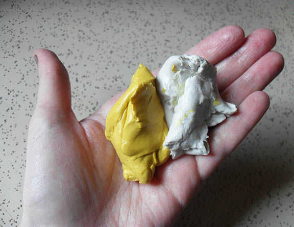 Tome cantidades iguales de cada recipiente y mezclarlos juntos. No hay ninguna ciencia real para determinar cuánto necesita utilizar. Globo ocular su objeto y saber que tienes que hacer suficiente masilla para cómodamente sobres una mitad de él.