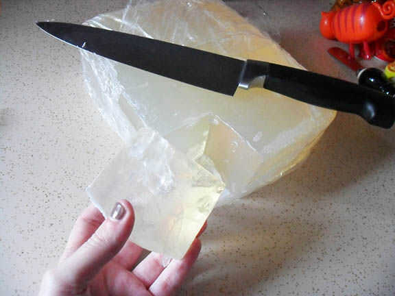 Con un gran cuchillo, cortó un trozo de glicerina. Tomé una pieza aprox. de 3 x 3 x 3 pulgadas y eso fue suficiente para 2 granadas.