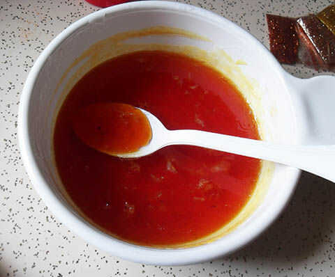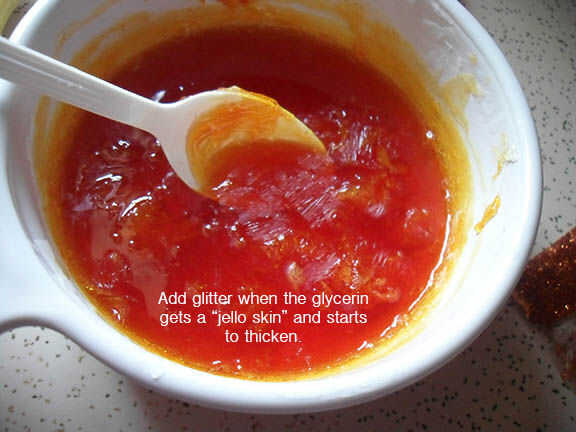 En este punto su glicerina probablemente comienza a espesar. Usted comenzará a ver una piel que se forman en la parte superior, como configuración de Jell-o. Este es el momento de añadir el brillo por lo que se suspende todo el jabón sin hundirse!