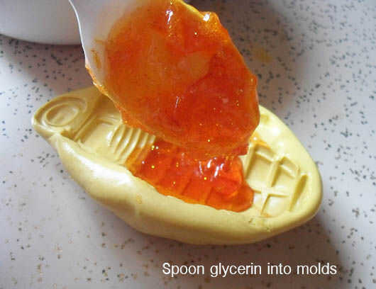 Si la glicerina está empezando a ser demasiado firme y pedazo, zap en el microondas durante 15 segundos y revolver. Establecer rápidamente, por lo que necesitará trabajar rápidamente! Otra vez, usted quiere que ser derretida, pero no hirviendo el líquido fundido.