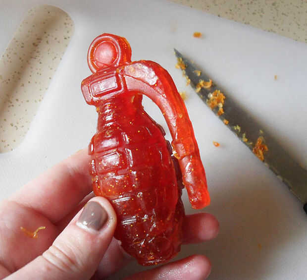 Haciendo una base de brillo suelto dentro de la Granada de jabón, le das al destinatario un estallido de sorpresa de brillo cuando finalmente llevan el jabón hasta el centro.
