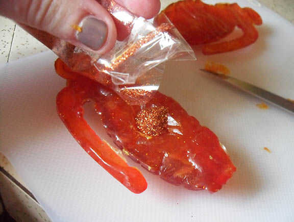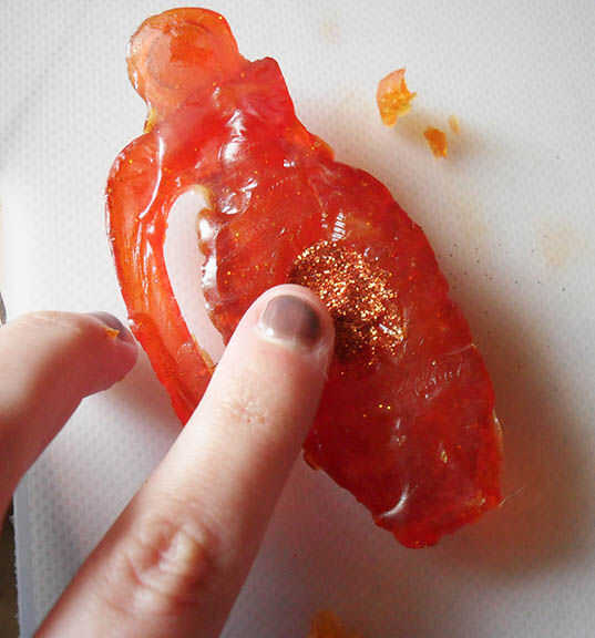 Vierta brillo suelta en el hoyo. Pat con el dedo que quede al ras con la superficie del jabón. Usé un brillo naranja audaz por la explosión de la sorpresa.