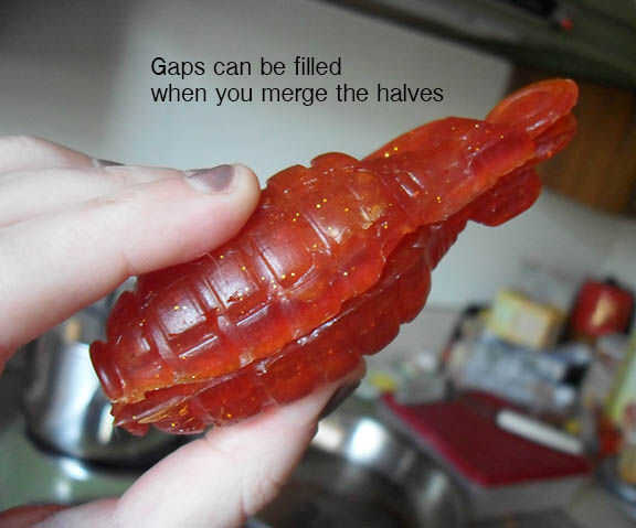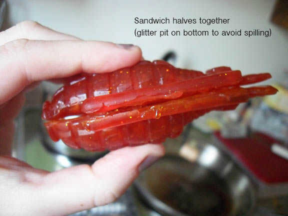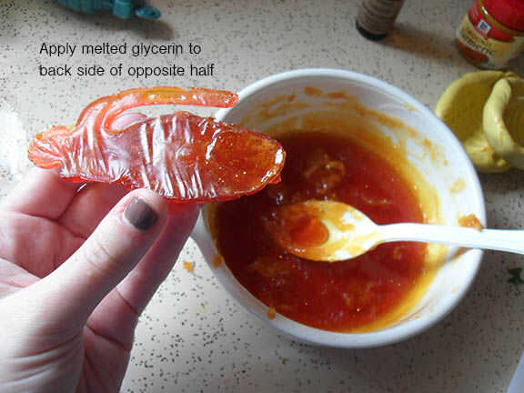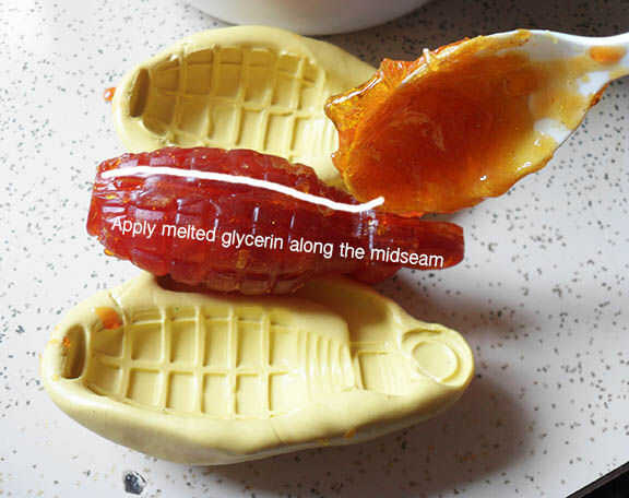 Como se sujetan las mitades, se puede observar tiene algunos boquetes e imperfecciones donde los dos se unen. Sellado de la costura media con la glicerina derretida se enlazar las mitades y ayudar a eliminar esos defectos.