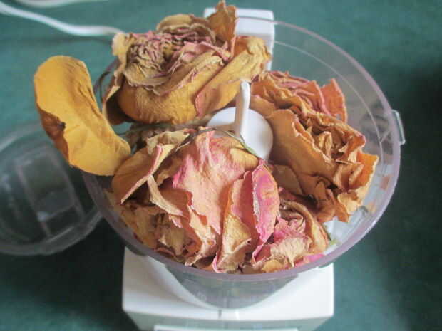 Pongo pétalo seco de rosa y pétalos de lavanda seca en mi procesador de alimentos mientras que estaba esperando toda mi mezcla se enfríe.