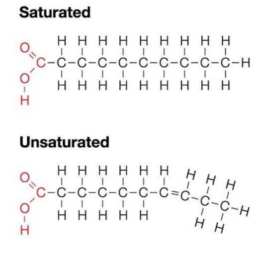Las grasas saturadas son largas y rectas, que significa que tienen un punto de fusión más alto que las grasas insaturadas. Las grasas insaturadas tienen dobles enlaces en la cadena de hidrocarburos, esto significa que tienen una menor temperatura de fusión. Además, los dobles enlaces más tienes, más fácil será para que la molécula romper aparte de lo que significa tiene un punto de fusión más alto. Si usted piensa de él de esta manera, la mantequilla es una grasa saturada, y a temperatura ambiente es sólido. Aceite de oliva es una grasa monoinsaturada y a temperatura ambiente es un líquido.