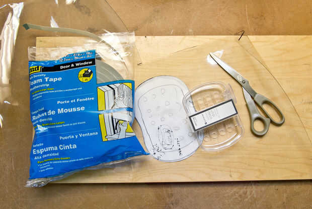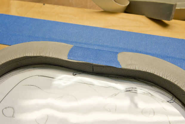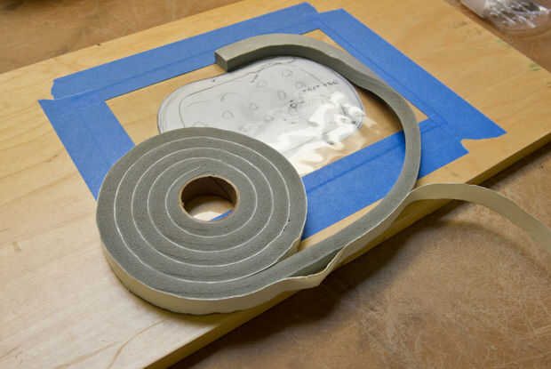 Desprenda el forro adhesivo y pegue las forma paredes abajo en su lugar, siguiendo la plantilla. Cinta de la costura donde se unen los bordes de los burletes. El adhesivo no es muy pegajoso, así que puede que necesite cinta abajo en algunos lugares si su forma tiene curvas cerradas.