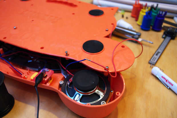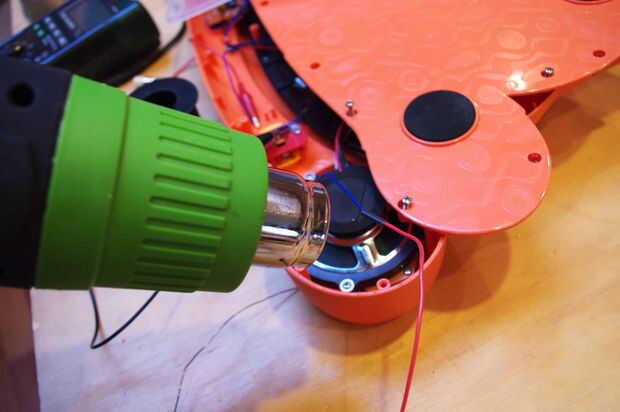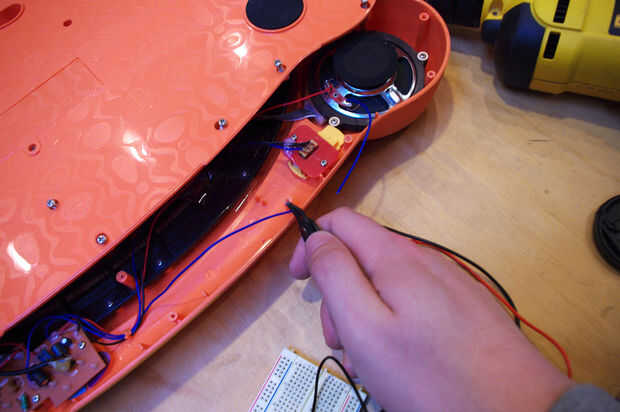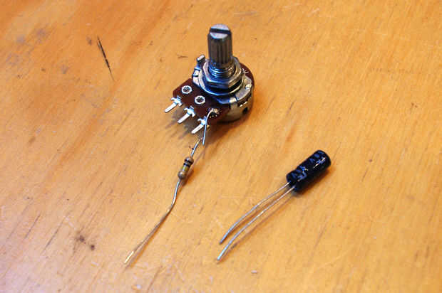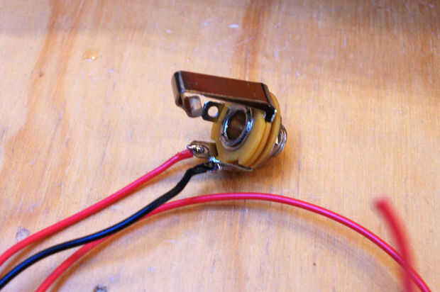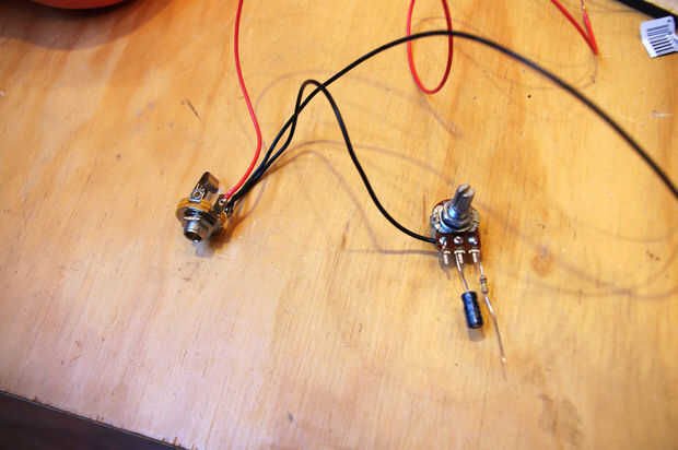 El lado positivo del condensador 10 uF se conecta al terminal del centro del potenciómetro y puentes a la ficha de señal en la toma de audio (donde se conecta el terminal negativo).