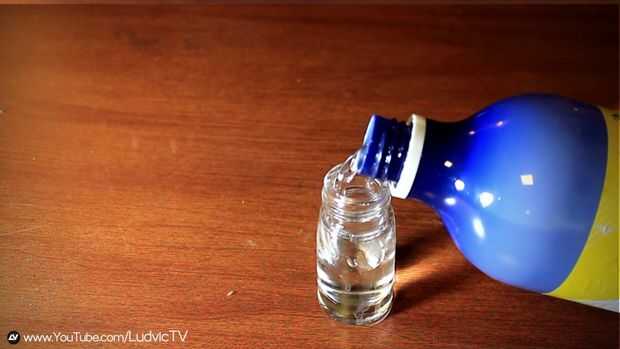 El manganeso está listo para reaccionar con el peróxido de hidrógeno, llenar el frasco pequeño con el líquido.