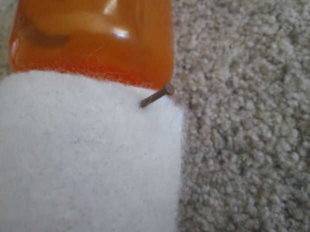 Envuelva la tela alrededor de la parte más pequeña de las botellas y clávelo en su lugar utilizando los agujeros previamente clavados.