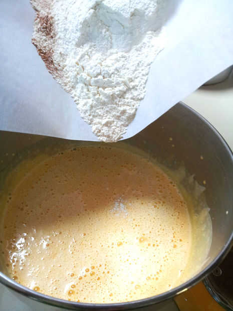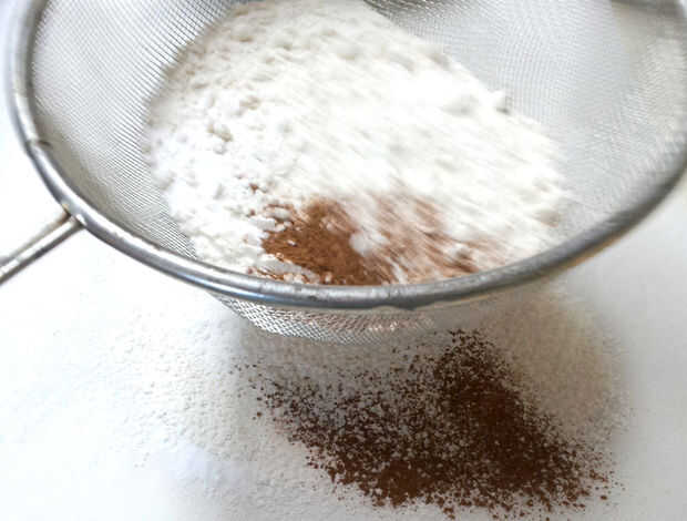 Tamizar juntos la harina, la canela y el bicarbonato de sodio.