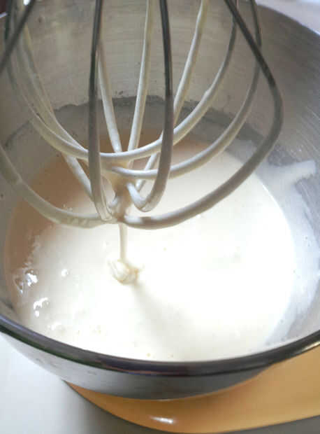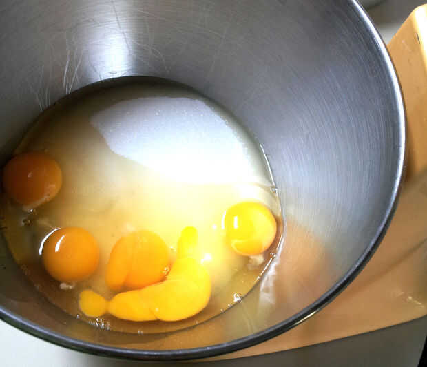 Batir huevos y azúcar hasta que la luz y de espesor.