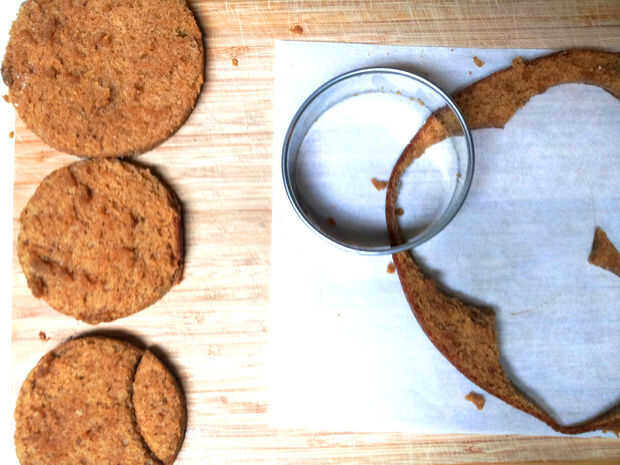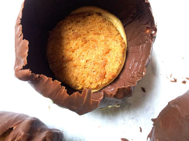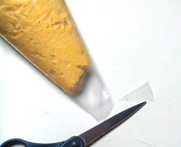 Utilizar una manga pastelera para una capa de espuma en la parte inferior. Luego poner un disco de tarta. Repetir estas 2 capas una vez más. Asegúrese de que la capa superior se detiene justo debajo de los ojos.