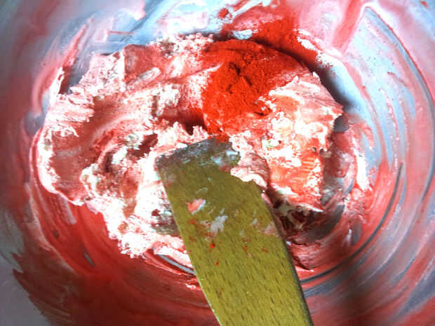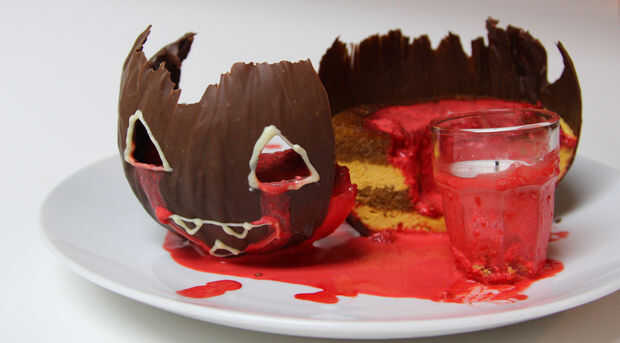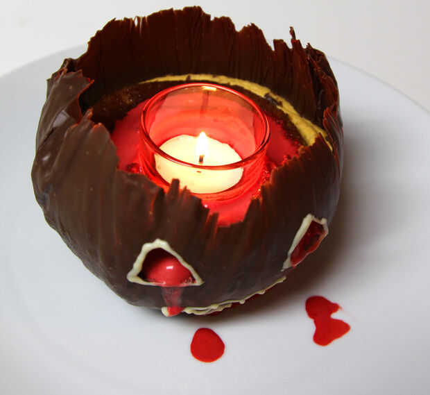 OK, aquí es cómo nos TI-puso una vela ligera del té en una de 2" vidrio de tiro, por lo que el calor de la llama puede calentar la mitad superior del vidrio. Mezclar alimentos rojo color en su helado de vainilla, cucharada un poco pastel y mousse en el centro, fregadero el vaso hasta la mitad para que el calor de llama de vela puede derretir el helado cuchara alrededor de él. El helado derretido se convierte en una deliciosa salsa aunque parece espeluznante.