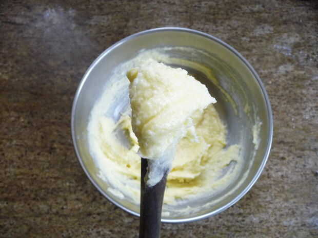 2) temperatura crema de mantequilla con azúcar hasta suave y pálido. Cuando usted frota un poco de la mezcla entre los dedos, no debería sentir demasiado granulada.