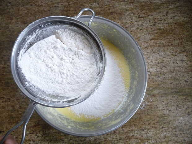 4) tamice juntos la harina y el polvo de hornear. Suavemente doble esta en los ingredientes húmedos. La mezcla debe ser espesa, más como una suave crema que una colable.