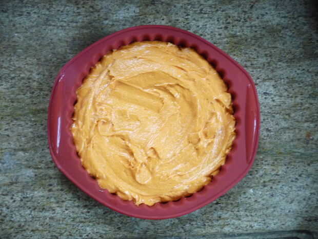 5) Vierta esto en el molde de la torta y repartidas en su diseño. No manchar porque se enfría y se lleve a cabo su forma. Es ideal para suavizar un poco más el centro y que sea menor que los lados, debido a esto ayuda el pastel terminado incluso alojarte. De lo contrario, el pastel tiende a subir más alto en el centro.
