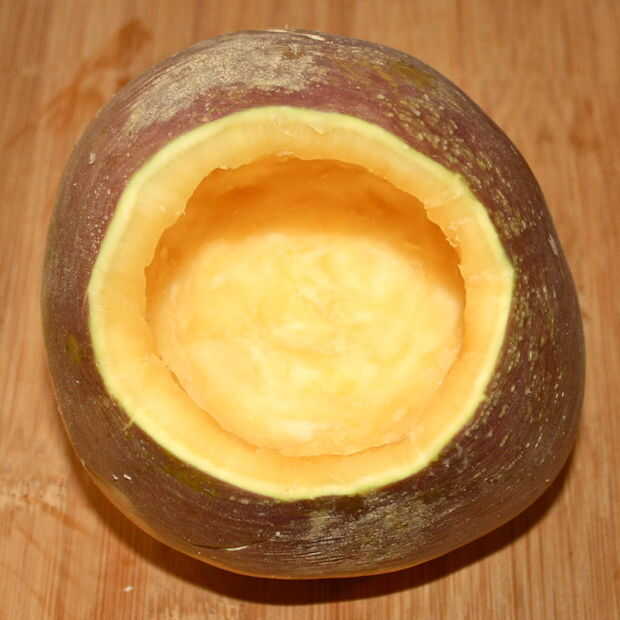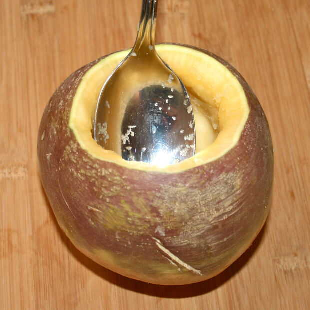 Utilice el cuchillo para empezar a te y la gran cuchara de metal para sacar las entrañas.