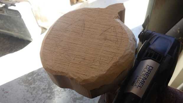 Ahora que tenemos la madera cortada en forma, tenemos que mantenerla firme para trabajar en él. Corté algunos 1" material de desecho en tiras de 4", pre había perforado dos agujeros en cada uno y había sujetado a la parte posterior de cada uno de los proyectos. Ahora podemos amarrar nuestro trabajo en un vicio y con ambas manos para el control de nuestras herramientas. Empezamos a talla por romper los bordes de nuestros proyectos con el Dremel Multi Max oscilante herramienta con una hoja de corte estrecho de madera en él. La forma más sencilla de hacer esto es mantener la hoja en ángulo con el borde afilado y cortar tiras, diferentes ángulos retirar diversas cantidades de material. Cuando habíamos esculpidos los bordes, doblamos la Multi-Max hasta que la hoja estaba en su borde y tallado en los ojos, narices y bocas, esto es una manera fácil de características de corte áspero las Jack-o-linternas. Cuando se hizo la talla aproximada, recurrimos a nuestra Dremel 7700 con un poco de corte cónica para limpiar los bordes y añadir detalles. Como con todas las herramientas, asegúrese de Prepárate cuando se utiliza una herramienta rotativa, para que tengas más control sobre la broca.