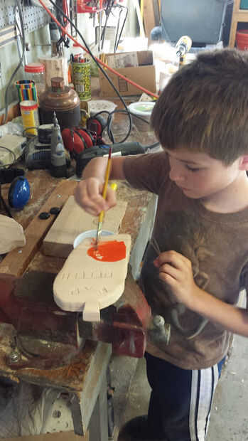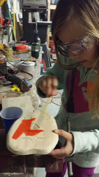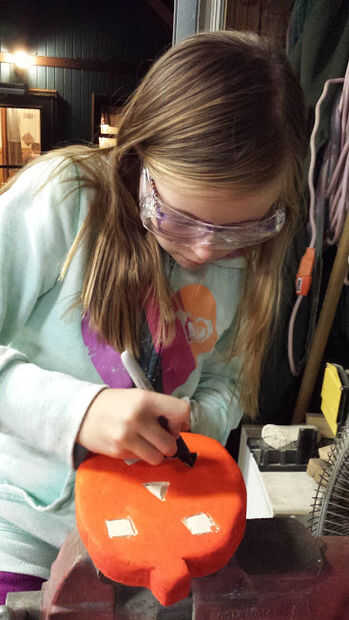 Dicho esto, elegimos utilizar tinte reactivo de la fibra, porque yo había hecho algunos ya desde la última vez que tie-dyed camisas. (Tal vez un futuro instructable?) Había cepillado el tinte anaranjado en los Jack-O-Lanterns, limpiar nuestros cepillos y utiliza el tinte verde para el tallo. Esto es cuando un fabricante se desvió del curso, mientras que Tennessee y he utilizado un rotulador para añadir detalles a nuestras tallas, Jay estaba ocupado pegando trozos de madera en tapas de botellas, que luego pega a su calabaza para los ojos! Cuando éramos felices con nuestras creaciones, me llevaron fuera y había rociado con sellador de madera de Helmsmans. Estaba cansado después de todo este divertido en la tienda, así que en lugar de los soportes, las compré. Usted puede también, en la mayoría ferreterías!