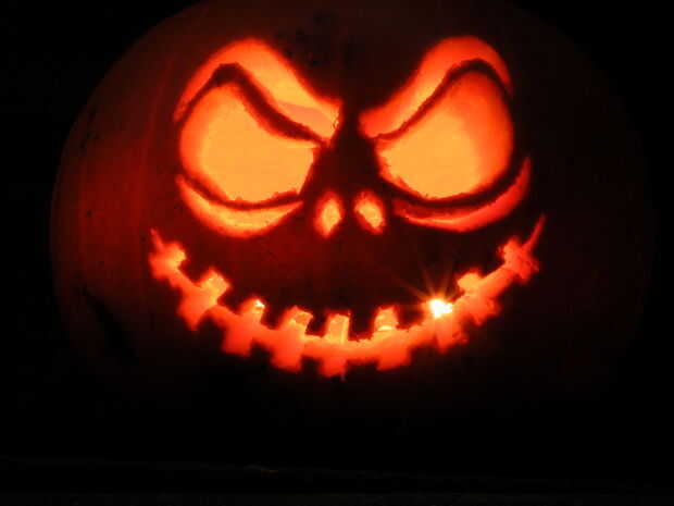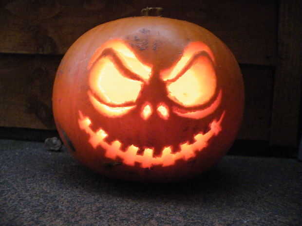 Descargar una imagen de la cara de Jack Skellington, retocado en PhotoShop Elements necesita menos tinta e impresas a un tamaño para que coincida con la calabaza.