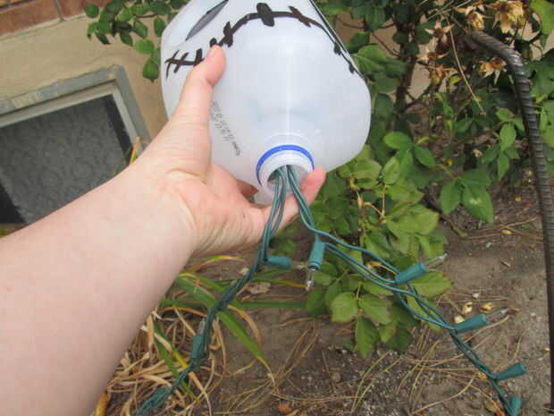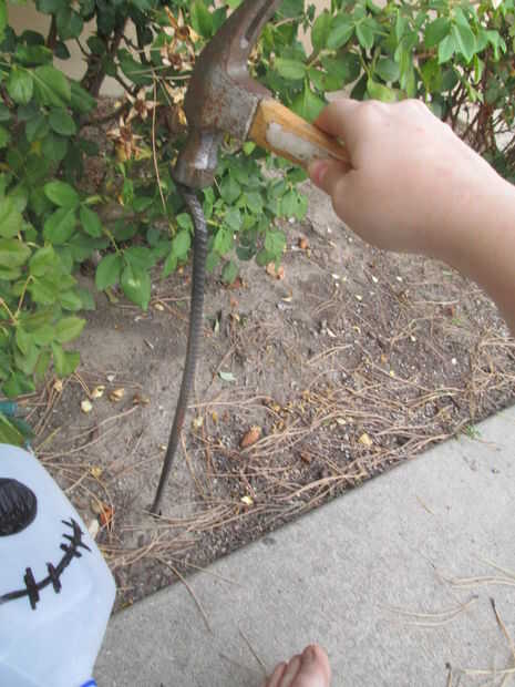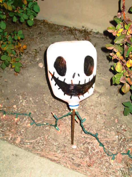 Para establecer la cabeza de Jack Skellington - martillo de la varilla en la tierra, (mina tienen una curva en ellos pero no tienes que tener una curva en el tuyo, tenemos la curva calentando la varilla, pegarse en un yunque y empujándolo hasta que hubo una curva) Conecte las luces de Navidad y se extienden a lo largo hasta llegar a su refuerzo. Cosas una longitud pequeña de las luces en la leche jarra luego deslice la jarra de leche sobre la varilla. Eso es todo! Ahora puede repetir el proceso de como desea con tantas cabezas de gato como usted hizo - espaciadas mi cabeza cerca de 2 pies y el efecto es realmente genial!