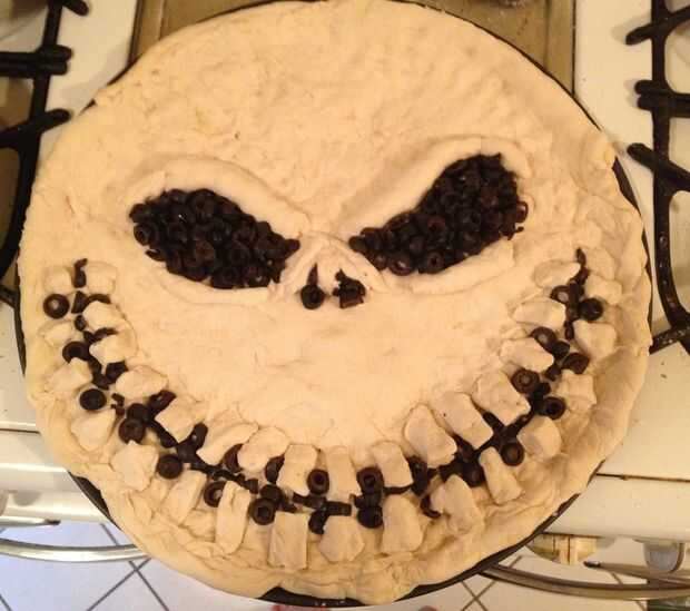 Ojos: enrolle la masa a formas de cilindro, dos unos más gruesos y dos más delgados / más corto. Coloque los cilindros más gruesos para formar la parte superior de los ojos de Jack y las más delgadas para formar el fondo de sus ojos. Rellenar los ojos con aceitunas (o su cobertura de elección). Asegúrese de que usted presione en para no romperse durante el horneado.