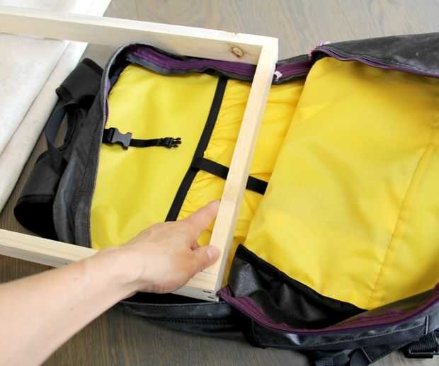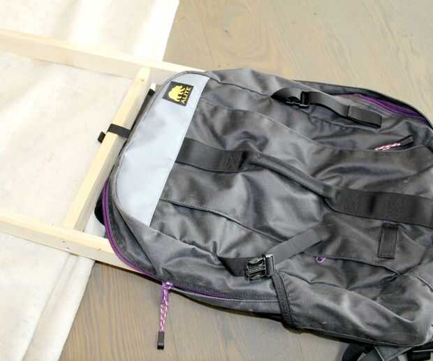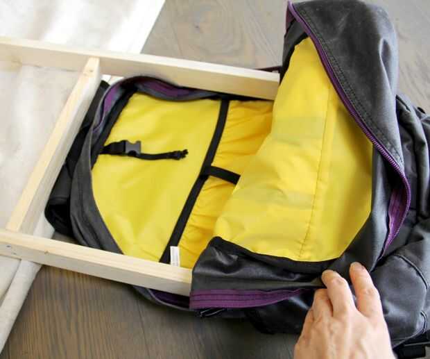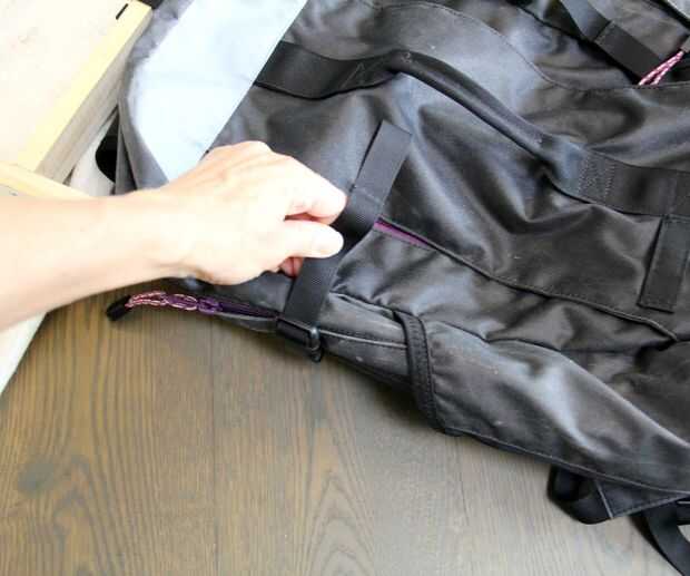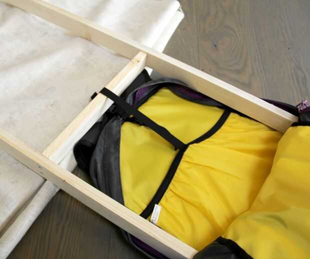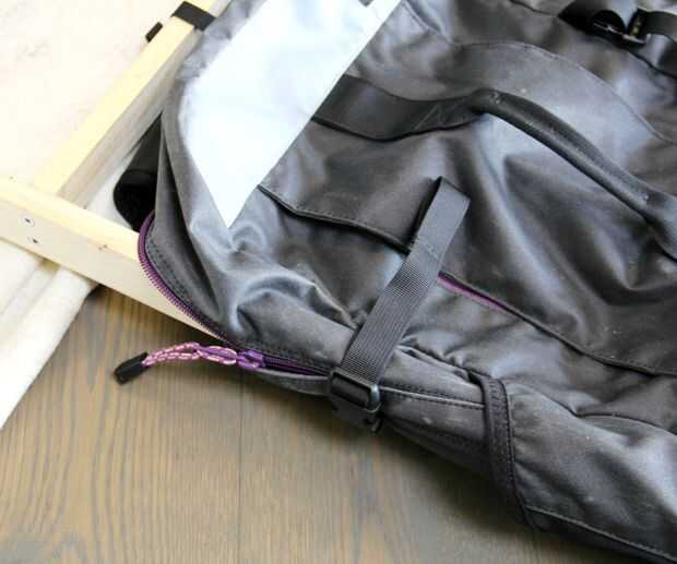 Dejando la tela y el marco como es, con patrón de la tela hacia abajo, cargue la parte inferior del marco en su paquete de cremalleras y cincha para que el marco esté allí. Este pack lo trabajaron bien porque tiene eso correa de la cincha poco interior hacia la parte superior que puede fijarse alrededor de la segunda pieza cruzada y las correas de la cincha de lado.