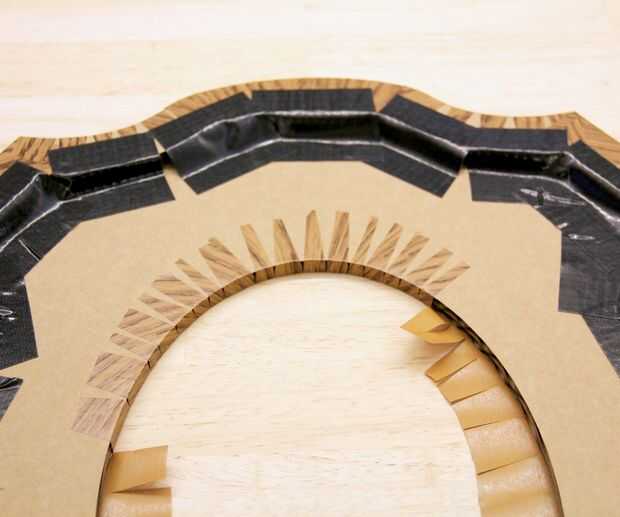 Tire de cada lengüeta tenso y pegarlo a continuación reverso del Monte. Repita hasta que todo el borde exterior está pegado en el lugar.