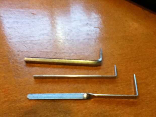 Esta es la pieza que se utiliza para poner presión en el cilindro de la cerradura mientras lo. Algunos ejemplos están en la foto a continuación. Utilizar sus partes movibles del limpiador de parabrisas para hacerlos con las tenazas y el vicio. Si necesita, utilice una estufa, soplete o un mechero para calentar para arriba. Usted puede también hacer esto con una llave allen vieja con su benchgrinder. Me gusta torcer mina como le impide poner mucha presión en la cerradura. El inferior ha sido torcido de esta manera.