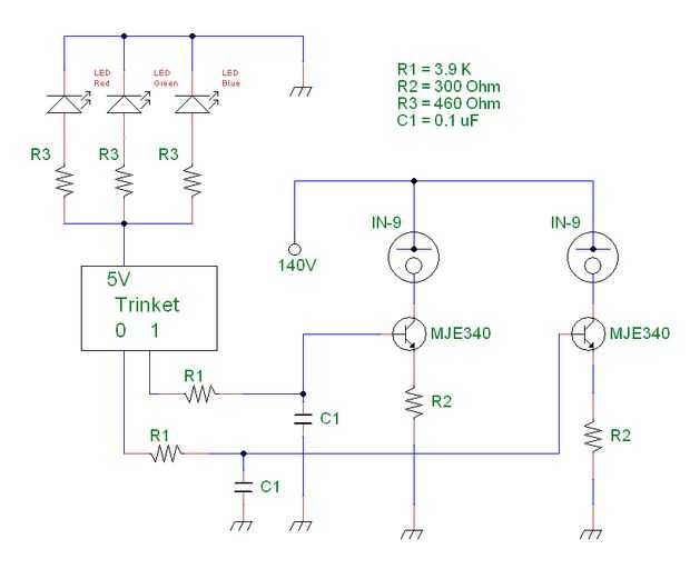 El Abalorio tiene 3 salidas que pueden suministrar la modulación de anchura de pulso (PWM), pero aquí sólo utilizaremos dos de las tres salidas 0 y 1 en el Abalorio. Mediante la adición de una resistencia y un condensador podemos filtrar los pulsos rápidos en una salida de la C.C. (casi). Esto puede usarse entonces para controlar la altura de la barra de nixie.