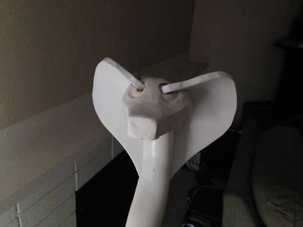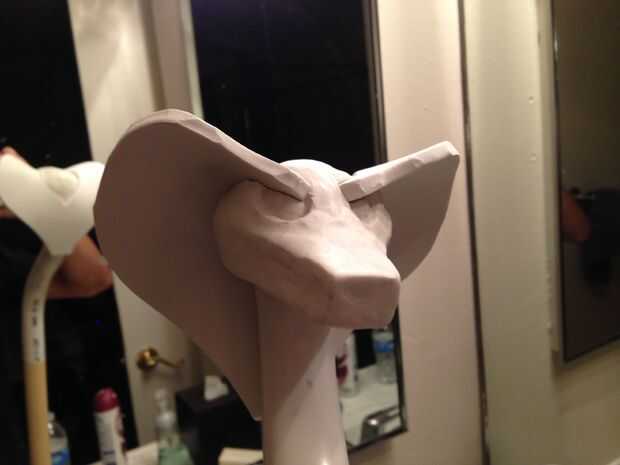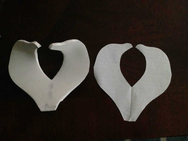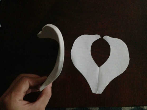 Traza la forma de la plantilla de papel en tu espuma de artesanía y recortarlo. La espuma será flexible, pero a intentar desenrollar hacia una forma plana. Para formarla en una curva, necesitará calentar cuidadosamente con tu pistola de calor, como hiciste con el tubo de PVC. Dan la campana general una curva en forma de c, luego doblar los bordes del ojo abajo en un ángulo hacia adentro.
