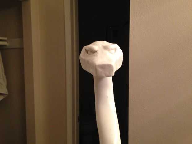 Cuando esté satisfecho con el ajuste, con cuidado quite la campana otra vez y póngala a un lado. Es el momento para endurecer la cabeza de arcilla. Normalmente se utiliza un horno para curar Sculpey, pero en este caso nuestra escultura se une a un tubo de plástico grande que complicará las cosas. En su lugar, utilice su fiel pistola para la cura. Sostenga la pistola de calor sobre tres o cuatro pulgadas de la escultura y mantenerlo en movimiento alrededor de la superficie. Tenga cuidado de no mantenerla por mucho tiempo sobre la misma área o que empiece a dorarse y crack.