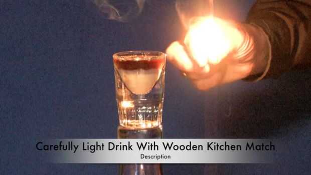 Ahora cuidadosamente tome un fósforo de cocina de madera y luz el Bacardi 151 llamas. Debido al alto contenido de alcohol del Ron 151, esto no debería ser demasiado difícil. Por favor, tenga cuidado!!!!