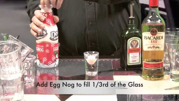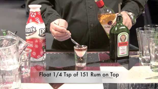 Por último, agregar 1/4 de una cucharadita de ron de Bacardi 151 en la parte superior el Jaegermeister. Con una cuchara es una buena manera de asegurarse de que usted no derrama ninguna del ron. Trate de no llene demasiado el vidrio, porque no quiero que viajes sobre el lado y en los dedos cuando se enciende la llama.