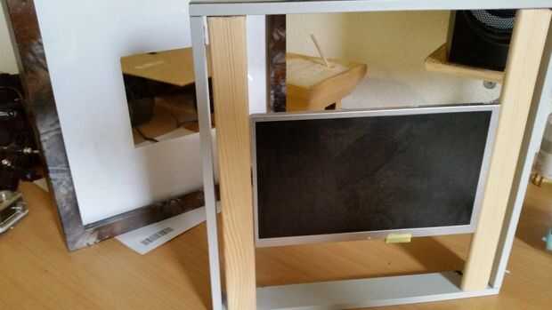 Yo trabaje con ella dos tiras de madera que encajan el espaciador y pegado al monitor a los palos y los palillos en el espaciador.