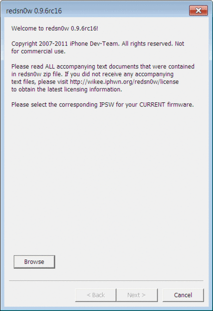 Paso 3: Lanzamiento RedSn0w y haga clic en buscar para seleccionar el 4.3.3 firmware que descargó en el paso 2.