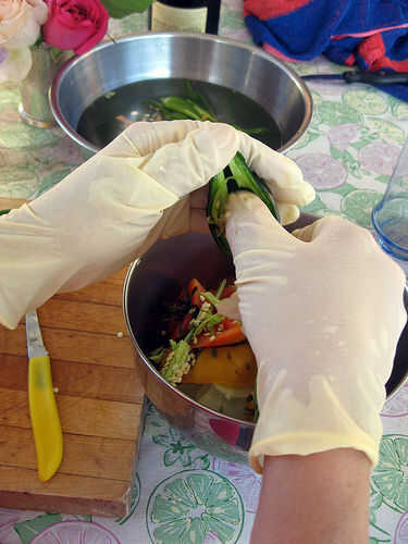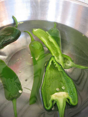 Consejo: Utilice guantes de látex al manipular jalapeños crudos, especialmente las semillas. De lo contrario, el aceite tendrá en sus manos y si Limpie tus ojos o picor de la nariz, estás en un mundo de dolor. Si no tienes guantes de látex, usar bolsas de plástico. Tirar guantes o bolsas tan pronto como haya terminado de usar. Lávese las manos con jabón sólo para asegurarse.