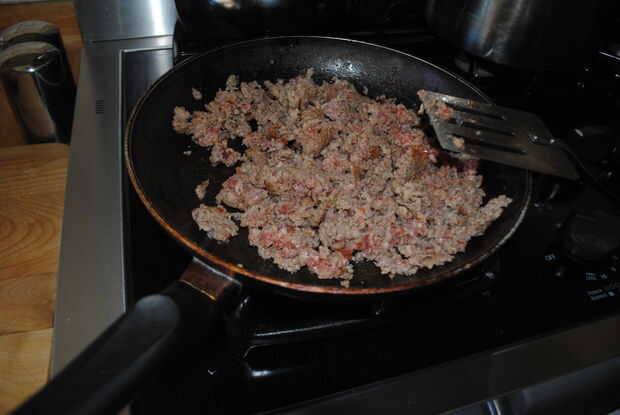 Freír chorizo a fuego medio hasta que estén doradas. Mientras se freír, cortar en trozos pequeños.