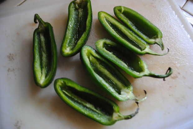 Cortar los jalapeños a lo largo y tratar de mantener los tallos.