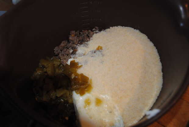 Combinar el queso crema ablandado, lata de chiles verdes, taza de queso parmesano y enfriado de embutidos. Mezclar bien.