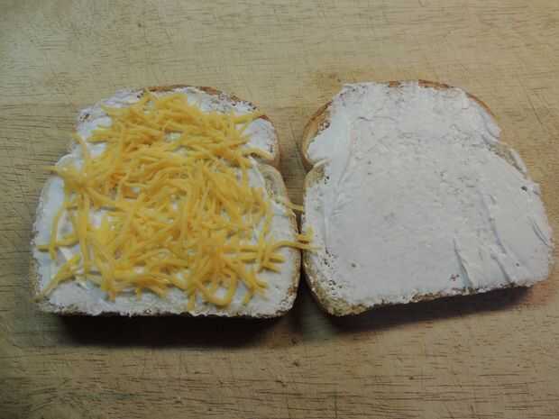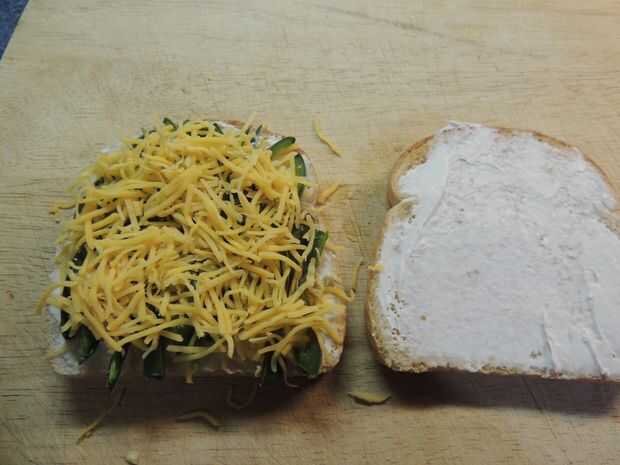 Tomar el queso crema y ablandar en el microondas durante 10-15 segundos. Esto contribuye a que sea más fácil de esparcir. Extender la mitad de la crema de queso sobre cada trozo de pan ligeramente tostado. Espolvoree 1/2 el Cheddar queso en un pedazo de pan tostado queso crema cubierto. Agregue la cantidad deseada de pimientos encima el queso rallado, seguido por el resto del queso rallado. Superior con el pedazo restante de tostado cubierto en queso crema, con la cara de queso hacia el interior del sándwich.