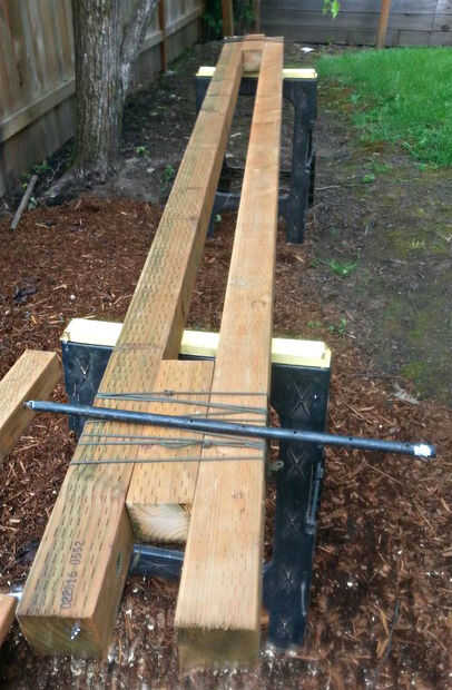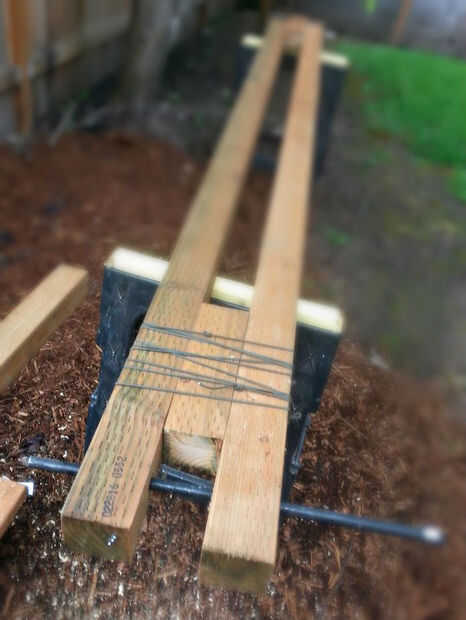 Lo quiero hacer es latigazo dos de la larga 4 x 4, intercalando las dos piezas pequeñas como se muestra. lazo tan estrecha como sea no posible, es gran cosa. Durante el uso, la fuerza no se está aplicando a las ligaduras (Molle). El cable está allí para sostener las piezas pequeñas de madera entre los más largos, por lo que actúan como bloques espaciadores.